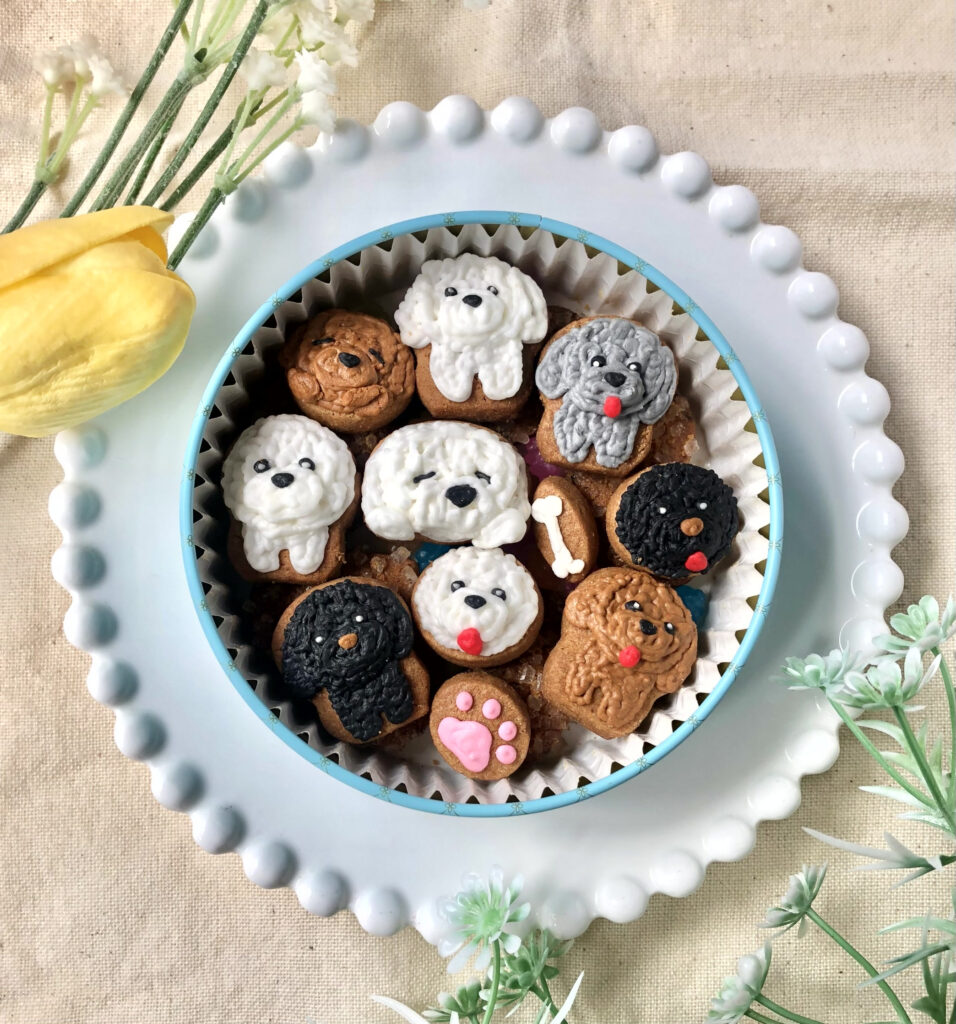 上段には 主役のトイプードルたちや骨、肉球などがデザインされたアイシングクッキー、